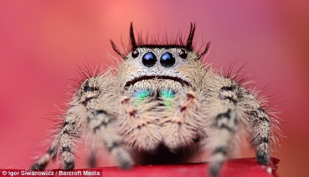 图片中:摄影师伊戈尔-斯瓦诺维斯兹在其德国慕尼黑的工作室借助微距镜头拍摄的跳蛛,学名“Phidippus Otiosus”